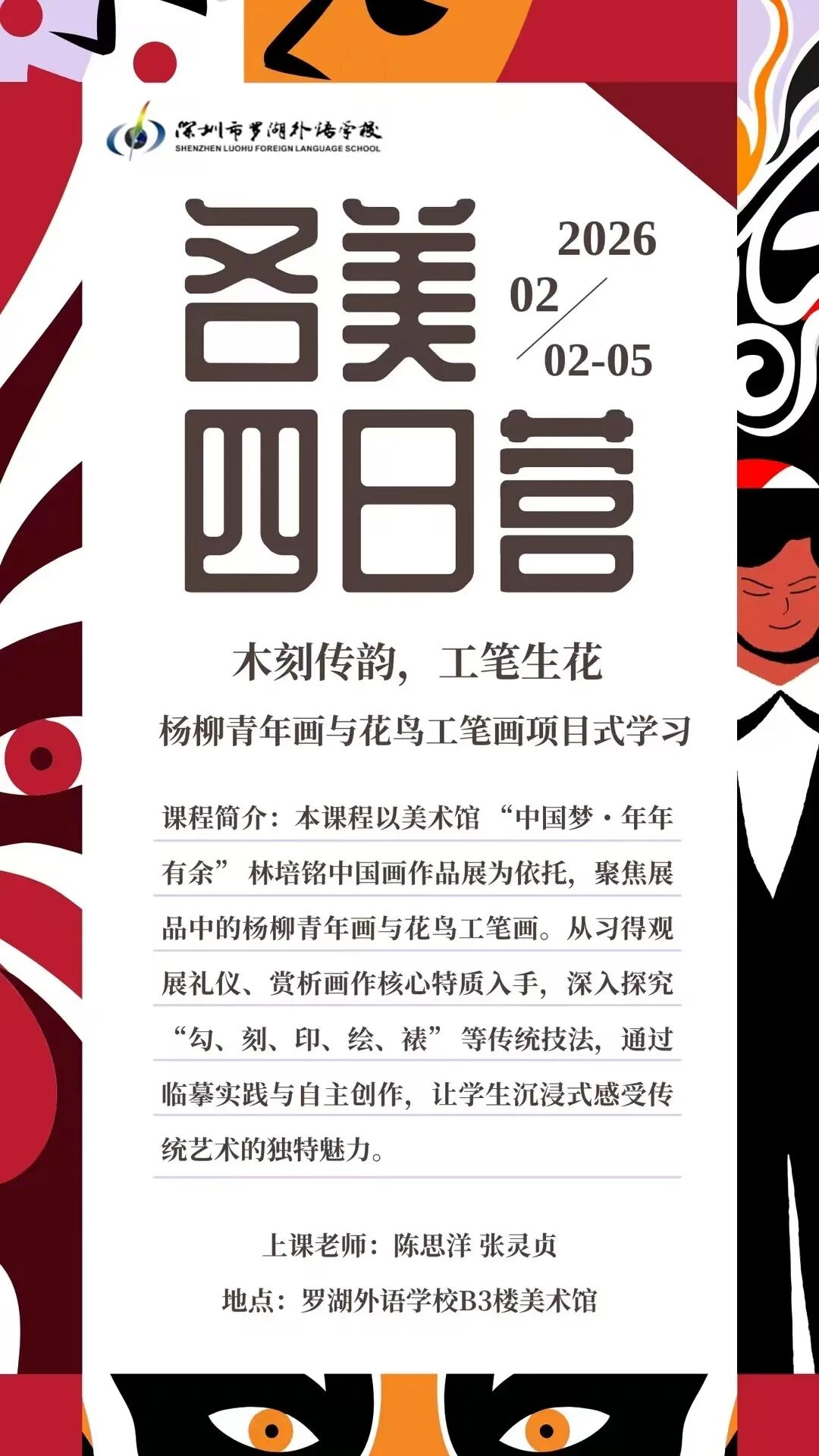 2025年12月28日,为贯彻党的二十届四中全会精神,落实习近平总书记文化思想,倡导传承和弘扬中华优秀传统文化,在德育中融入中华优秀传统文化元素,在美育中汲取艺术精髓,引导学生树立正确的审美观、文化观,在2026元旦和马年春节到来之际,“中国梦·年年有余—林培铭中国画作品展”开幕式在深圳罗湖外语学校美术馆举行,同时举办国家非遗杨柳青木版年画精品展,希望通过中国画作品与非遗年画的并置,让水墨的意境与木版年画的色彩里,感受传统艺术的生命力,了解和感受非遗艺术的历史传承和文化特色,亲身体会到中华优秀传统技艺的匠心和魅力,提升学生的审美水平和文化素养。